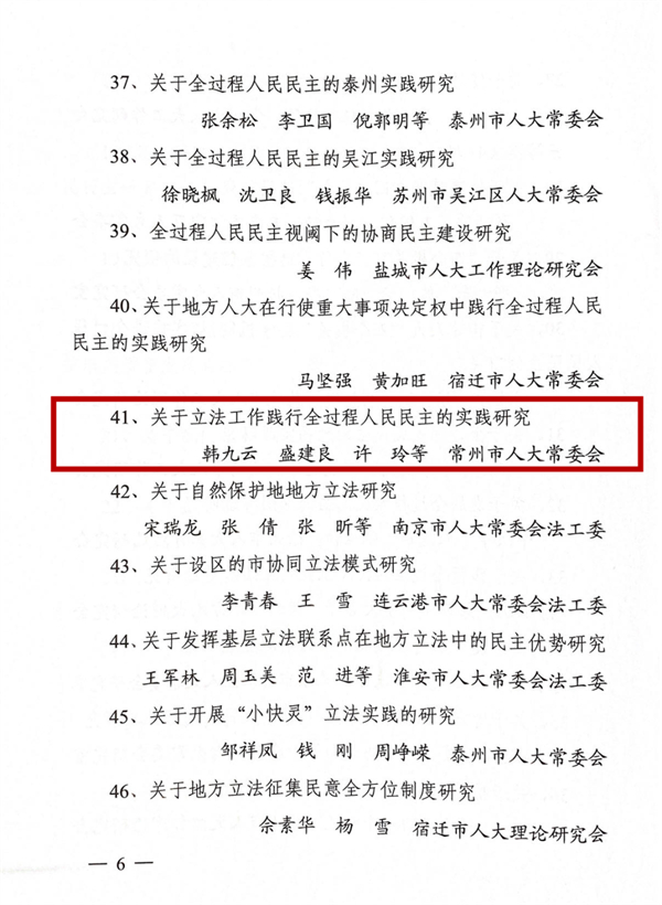 常州市人大工作研究会提交的《关于发展全过程人民民主的常州实践研究》被评为二等奖,市人大常委会法工委提交的《关于立法工作践行全过程人民民主的实践研究》被评为三等奖。